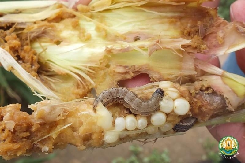 เมล็ดพันธุ์ 1กิโลกรัม - ระยะหลังปลูก หมั่นสำรวจแปลงปลูก ตั้งแต่เริ่มงอก หากพบกลุ่มไข่ และหากพบการระบาดรุนแรงใช้สารเคมีป้องกัน ฉีดพ่นด้วยสารอีมาเมกตินเบนโซเอต 5% เอสจี อัตรา 10 กรัมต่อน้ำ 20 ลิตร