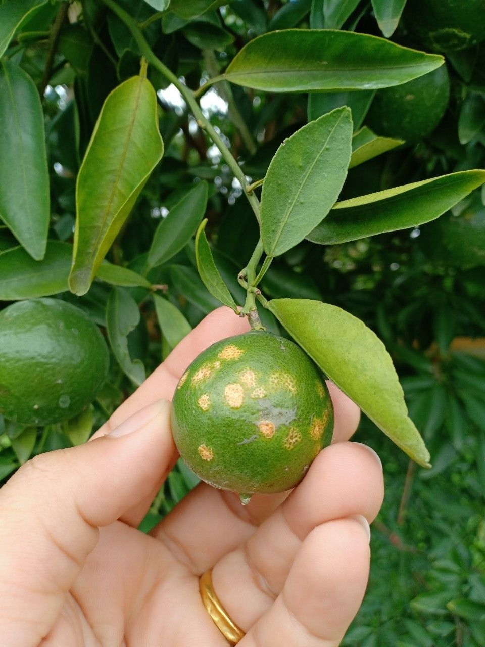 ในช่วงที่สภาพอากาศเปลี่ยนแปลง ฝนตก แดดร้อน อาจทำให้สรีระพืชและสภาพอากาศ ทำให้ผิวเปลือกส้มเกิดแผลจากการที่ต่อมน้ำมันขยายตัวจนแตก หรืออาจเกิดจากการเข้าทำลายของแมลงปากดูด ทำให้ต่อมน้ำมันบนผิวเปลือกส้มเสียหาย แล้วจึงเกิดเชื้อราที่มากับน้ำฝน เข้าทำลายซ้ำ ลักษณะอาการพบเป็นจุดแต้มสีเหลือง แผลค่อนข้างกลม และกระจายไปทั่วผิวของผลส้ม
